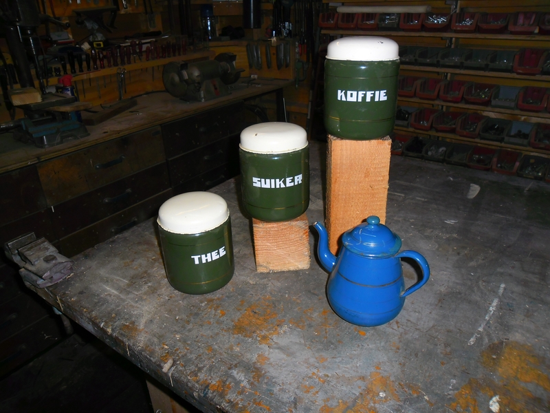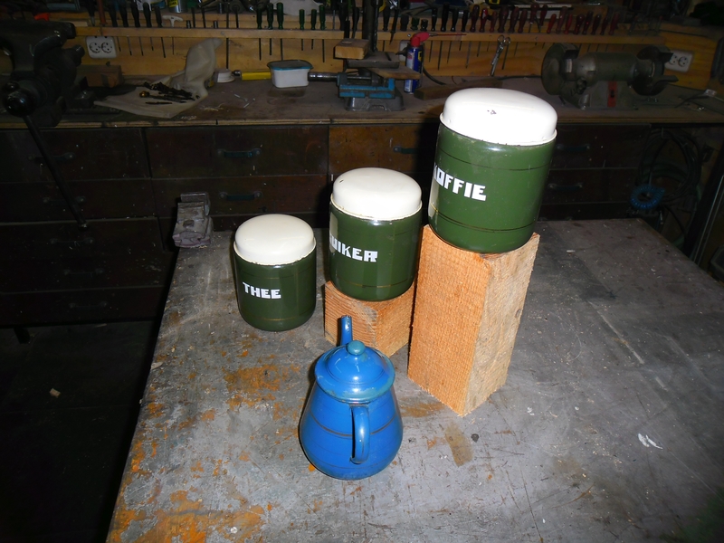 Te koop uit grootmoeders tijd, drie geemaileerde bussen, suiker thee en koffie, uiteraard met gebruikerssporen. tevens doe ik er nog een leuk geemaileerd theepotje bij.