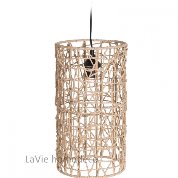 De hang lamp is gemaakt van metaaldraad wat omvlochten is met tot touw geweven papier.