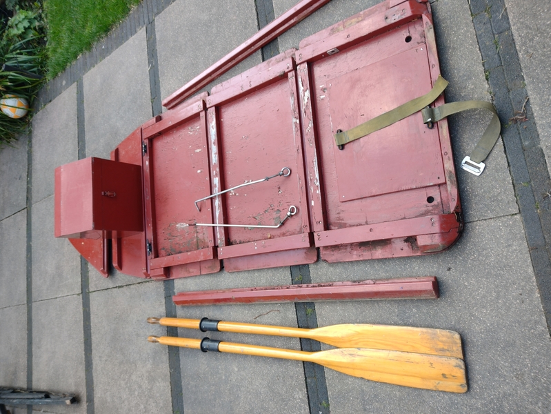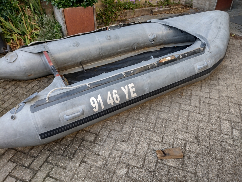Optie: Samen met een gratis rubber boot, 4m. Achilles, hypalon. Met houten vlonders. De opblaasbare kiel is vervangen door een houten frame, maar de boot vaart er niet minder om. 1 compartiment is een klein beetje lek maar blijft hard genoeg voor een dag varen.